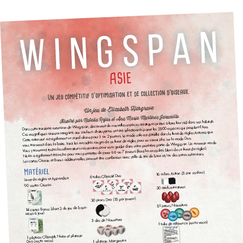 Wingspan Asia is both an expansion for Wingspan, adding new bird species, and a standalone game for two players! (FR ONLY)